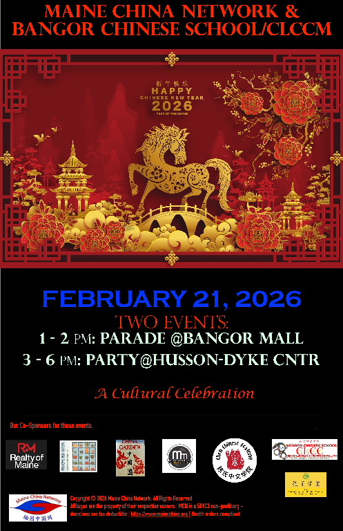 Once again, our Chinese New Year Parade is set in Bangor Mall. This year, it will be on the First Day of the Year of the Dragon, February 10th, 2024. We will start line up by 1PM, the parade takes about half an hour. We will have activities for Children, and a photo booth where you can try on some Chinese traditional clothing and take pictures. Free to join! This year, we also teamed up with Bangor Chinese School. After the parade, the public is welcome to move to the Dyke Center at Husson University for some Chinese performances and dinner. The dinner will be $10/person or $25/family.